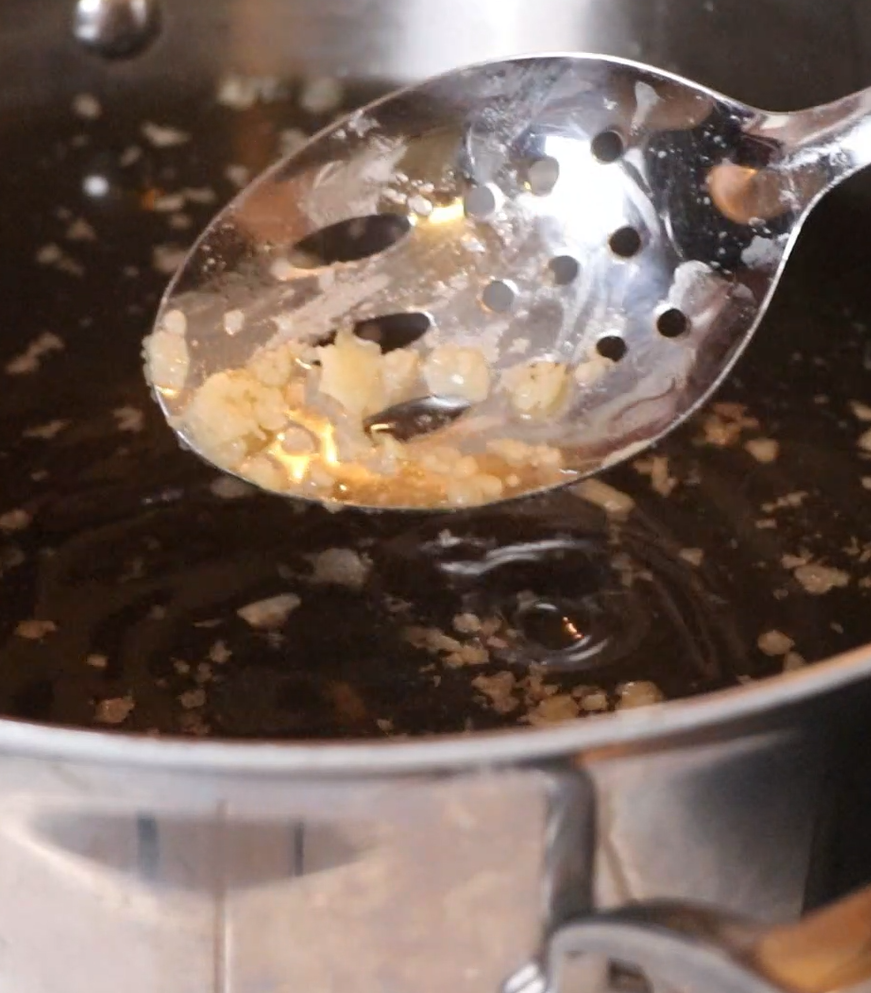 - When the broth is rich golden brown, strain the liquids from the solids. I use a large mesh strainer.