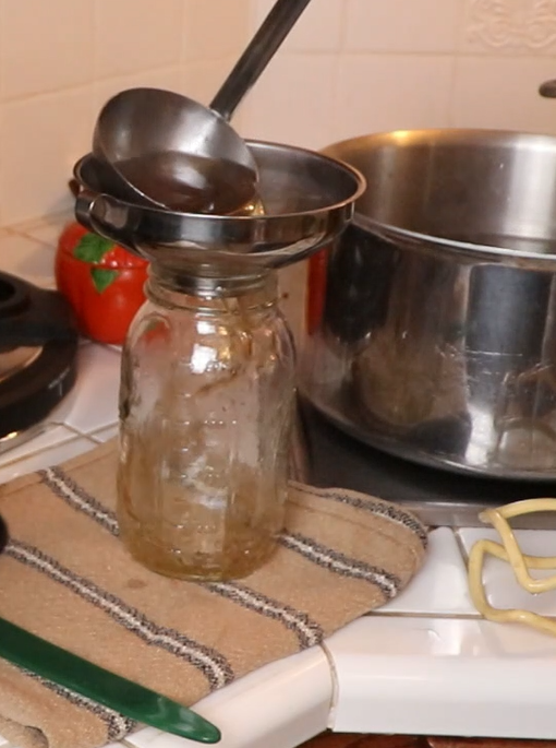 - Carefully open the canner and remove one of the hot jars. Pour out the water in the jar. Place the jar on a towel and fill with chicken broth to 1 inch of headspace. Screw on lid and ring (not too tight.) Put the jar back into the canner and repeat for each jar.